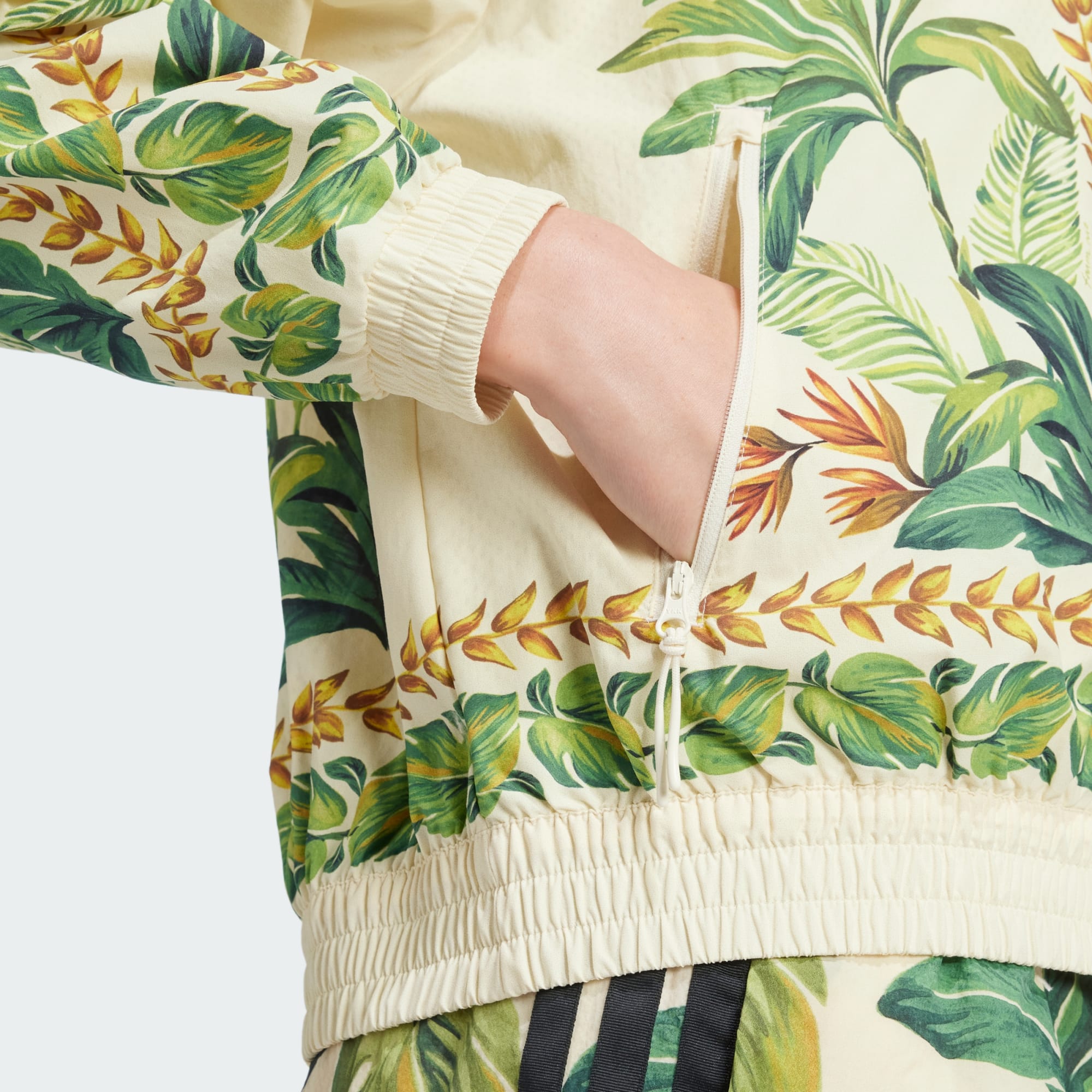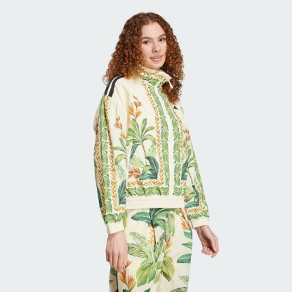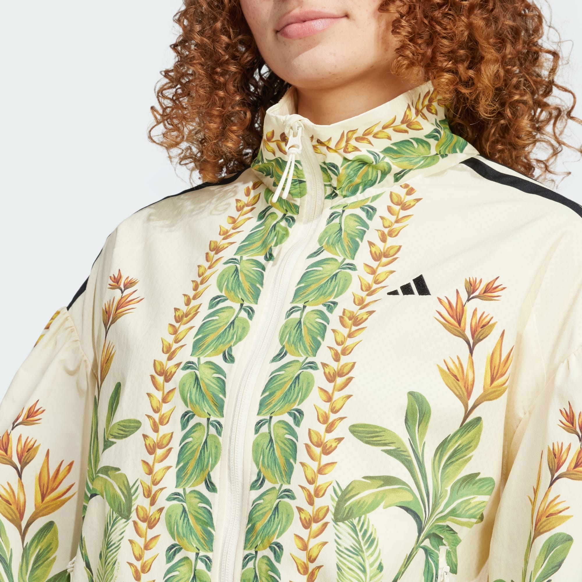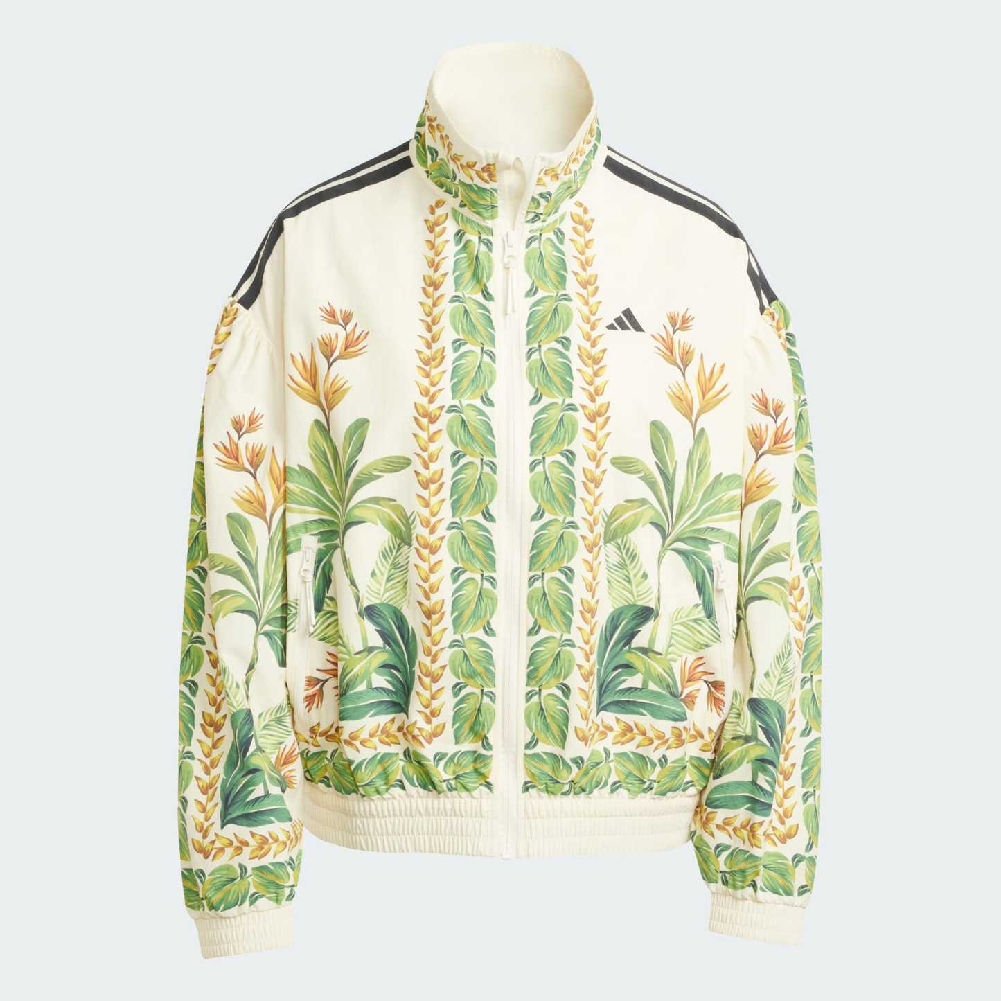 A striking fusion of sport style and high fashion, this adithtdas jacket shows off a fresh, colorful look. Made in collaboration with FARM Rio, a foliage pattern inspired by the energy of the desert adds an eye-catching edge to any outfit. Dress it up with high-waisted slacks for a night out, or pair it with leggings for a casual outing with friends. No matter how you rock it, the loose fit and smooth nylon build will keep you comfortable and feeling free.